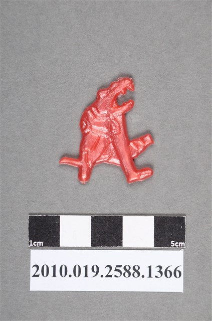 1.本物件為紅色人型尪仔仙。硬質塑膠材質,扁平,單一不透明紅色,雙面浮雕圖案。正面圖案為鱷魚頭人型,嘴巴張開,可見牙齒,手的形狀和大小怪異,有尾巴,用雙腳走路。2.尪仔仙尺寸大致可分成小、中、大型,小型約長2-5公分,中型約長8-15公分,顏色以單色為主。有些大型的則可長達30公分左右,以菩薩、神仙和民間傳說故事人物等造型為主,塗上金銀紅黃彩漆等亮色。1960、70年代的尪仔仙多以民間傳說故事、歌仔戲、布袋戲人物為造型。1980年代改以卡通、電玩、漫畫人物造型為主。常見玩法之一為兩人(或多人)各持一只尪仔仙,輪流用手指彈射,看誰的尪仔仙先疊在對方上面,便可贏得對方用來對戰或是約定的尪仔仙。