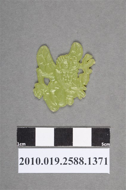 1.本物件為黃色蟲型尪仔仙。硬質塑膠材質,扁平,單一不透明黃色,雙面浮雕圖案,兩面圖案相同。圖案為擬人化的蟲類,其臉部帶著眼鏡,有1雙翅膀,翅膀處於打開的狀態,有手腳。2.尪仔仙尺寸大致可分成小、中、大型,小型約長2-5公分,中型約長8-15公分,顏色以單色為主。有些大型的則可長達30公分左右,以菩薩、神仙和民間傳說故事人物等造型為主,塗上金銀紅黃彩漆等亮色。1960、70年代的尪仔仙多以民間傳說故事、歌仔戲、布袋戲人物為造型。1980年代改以卡通、電玩、漫畫人物造型為主。常見玩法之一為兩人(或多人)各持一只尪仔仙,輪流用手指彈射,看誰的尪仔仙先疊在對方上面,便可贏得對方用來對戰或是約定的尪仔仙。