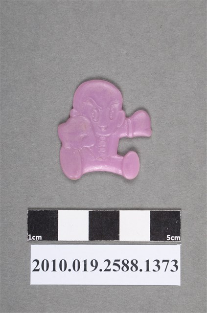 1.本物件為拳擊人型尪仔仙。硬質塑膠材質,扁平,單一不透明紫色,雙面浮雕圖案,兩面圖案相同。圖案為光頭男生,眉毛明顯,呈坐姿,雙手握拳,有一拳往前擊。2.尪仔仙尺寸大致可分成小、中、大型,小型約長2-5公分,中型約長8-15公分,顏色以單色為主。有些大型的則可長達30公分左右,以菩薩、神仙和民間傳說故事人物等造型為主,塗上金銀紅黃彩漆等亮色。1960、70年代的尪仔仙多以民間傳說故事、歌仔戲、布袋戲人物為造型。1980年代改以卡通、電玩、漫畫人物造型為主。常見玩法之一為兩人(或多人)各持一只尪仔仙,輪流用手指彈射,看誰的尪仔仙先疊在對方上面,便可贏得對方用來對戰或是約定的尪仔仙。