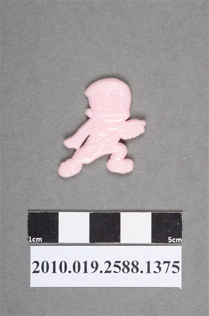 1.本物件為卡通忍者哈特利(忍者小叮噹)之哈特利尪仔仙。硬質塑膠材質,扁平,單一不透明粉紅色,雙面浮雕圖案,兩面圖案相同。圖案為臉頰上的螺旋形酒窩的哈特利準備戰鬥的樣子,頭上戴有頭巾,身穿忍者服,鞋子樣式為夾腳,一手反手拿著劍,一腳伸直,一腳彎曲。