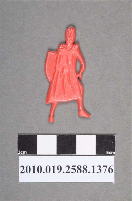 1.本物件為持盾人型尪仔仙。硬質塑膠材質,扁平,單一不透明紅色,雙面浮雕圖。正面圖案為站立男性人型,其服裝有披風,左手拿著盾牌,盾牌上有類似菱形的圖案,右手無拿東西。2.尪仔仙尺寸大致可分成小、中、大型,小型約長2-5公分,中型約長8-15公分,顏色以單色為主。有些大型的則可長達30公分左右,以菩薩、神仙和民間傳說故事人物等造型為主,塗上金銀紅黃彩漆等亮色。1960、70年代的尪仔仙多以民間傳說故事、歌仔戲、布袋戲人物為造型。1980年代改以卡通、電玩、漫畫人物造型為主。常見玩法之一為兩人(或多人)各持一只尪仔仙,輪流用手指彈射,看誰的尪仔仙先疊在對方上面,便可贏得對方用來對戰或是約定的尪仔仙。