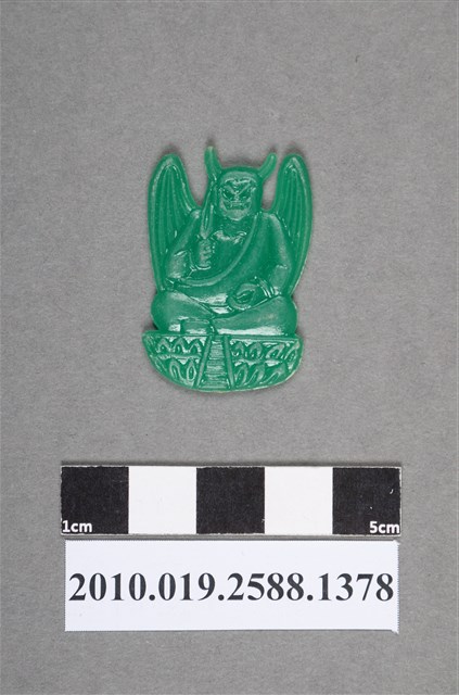 1.本物件為綠色怪物尪仔仙。硬質塑膠材質,扁平,單一不透明綠色,雙面浮雕圖案,兩面圖案相同。圖案為盤腿坐在蓮花座上的怪物,其頭上長有2個角,臉部表情邪惡,背上有翅膀,一手舉著雙叉型物品,一手放在腿上。2.尪仔仙尺寸大致可分成小、中、大型,小型約長2-5公分,中型約長8-15公分,顏色以單色為主。有些大型的則可長達30公分左右,以菩薩、神仙和民間傳說故事人物等造型為主,塗上金銀紅黃彩漆等亮色。1960、70年代的尪仔仙多以民間傳說故事、歌仔戲、布袋戲人物為造型。1980年代改以卡通、電玩、漫畫人物造型為主。常見玩法之一為兩人(或多人)各持一只尪仔仙,輪流用手指彈射,看誰的尪仔仙先疊在對方上面,便可贏得對方用來對戰或是約定的尪仔仙。