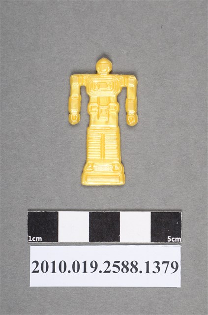1.本物件為黃色機器人型尪仔仙。硬質塑膠材質,扁平,單一不透明黃色,雙面浮雕圖案,兩面圖案相同。圖案為站立機器人,頭小身大,臉部不見五官。肩膀明顯,胸前有方形圖案,內部有雙圓,雙手呈拳狀,雙腳有橫條紋並且併攏。2.尪仔仙尺寸大致可分成小、中、大型,小型約長2-5公分,中型約長8-15公分,顏色以單色為主。有些大型的則可長達30公分左右,以菩薩、神仙和民間傳說故事人物等造型為主,塗上金銀紅黃彩漆等亮色。1960、70年代的尪仔仙多以民間傳說故事、歌仔戲、布袋戲人物為造型。1980年代改以卡通、電玩、漫畫人物造型為主。常見玩法之一為兩人(或多人)各持一只尪仔仙,輪流用手指彈射,看誰的尪仔仙先疊在對方上面,便可贏得對方用來對戰或是約定的尪仔仙。