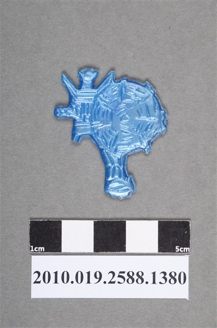 1.本物件為卡通聖戰士(百獸王)之聖戰士尪仔仙。硬質塑膠材質,扁平,單一不透明藍色,雙面浮雕圖案。正面圖案為站立機器人型,其腳部可見獅頭造型,左手握拳往後拉,右手拿著圓盤狀物體。尪仔仙有破損,左腳斷掉。