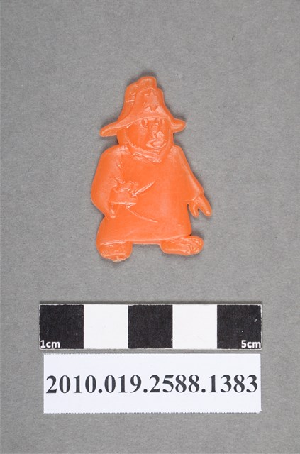 1.本物件為戴帽人型尪仔仙。硬質塑膠材質,扁平,單一不透明橘色,雙面浮雕圖案,兩面圖案相同。圖案為擬人化的動物,五官不似人類,戴著大帽子,帽子正中間有6角星,穿著袍子,袍長至腳掌。其一手抓著袍子,故可見皺褶,一手自然垂放,雙腳著地。2.尪仔仙尺寸大致可分成小、中、大型,小型約長2-5公分,中型約長8-15公分,顏色以單色為主。有些大型的則可長達30公分左右,以菩薩、神仙和民間傳說故事人物等造型為主,塗上金銀紅黃彩漆等亮色。1960、70年代的尪仔仙多以民間傳說故事、歌仔戲、布袋戲人物為造型。1980年代改以卡通、電玩、漫畫人物造型為主。常見玩法之一為兩人(或多人)各持一只尪仔仙,輪流用手指彈射,看誰的尪仔仙先疊在對方上面,便可贏得對方用來對戰或是約定的尪仔仙。