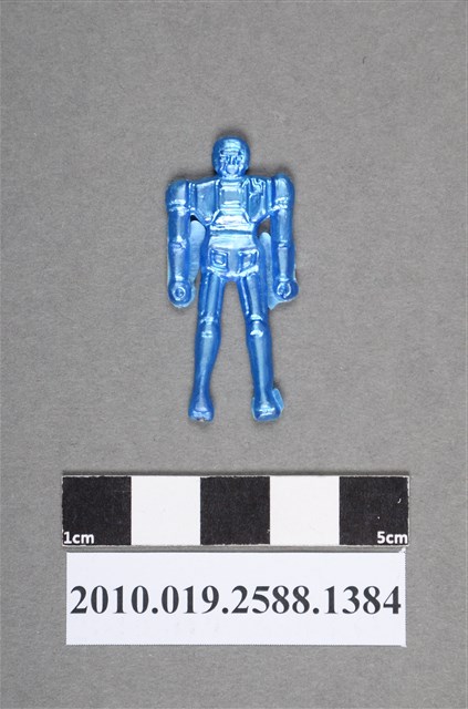 1.本物件為藍色機器人型尪仔仙。硬質塑膠材質,扁平,單一不透明藍色,雙面浮雕圖案,兩面圖案相同。圖案為站立機器人,頭小身大,臉部有眼睛、鼻子和嘴巴,胸前有方形圖案,腹部有2個菱形圖案,雙手垂下。2.尪仔仙尺寸大致可分成小、中、大型,小型約長2-5公分,中型約長8-15公分,顏色以單色為主。有些大型的則可長達30公分左右,以菩薩、神仙和民間傳說故事人物等造型為主,塗上金銀紅黃彩漆等亮色。1960、70年代的尪仔仙多以民間傳說故事、歌仔戲、布袋戲人物為造型。1980年代改以卡通、電玩、漫畫人物造型為主。常見玩法之一為兩人(或多人)各持一只尪仔仙,輪流用手指彈射,看誰的尪仔仙先疊在對方上面,便可贏得對方用來對戰或是約定的尪仔仙。
