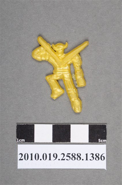 1.本物件為卡通聖戰士(百獸王)之聖戰士尪仔仙。硬質塑膠材質,扁平,單一不透明黃色,雙面浮雕圖案。正面圖案為機器人型,背後有個V字型,手和腳部可見獅頭造型,左手彎起,右手垂放,左腳彎起,右腳伸直。