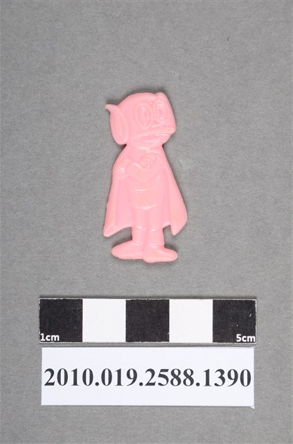 1.本物件為漫畫小超人帕門之小超人帕門尪仔仙。硬質塑膠材質,扁平,單一不透明粉紅色,雙面浮雕圖案,兩面圖案相同。圖案為男孩頭戴頭盔,身穿披風,雙手交叉於胸前之人型。