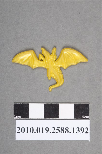 1.本物件為多頭龍尪仔仙。硬質塑膠材質,扁平,單一不透明黃色,雙面浮雕圖案。正面圖案為5頭龍,各頭往不同方向看,有尾巴和翅膀,翅膀展翅,呈在飛行的姿勢。
