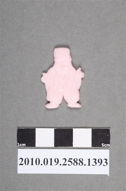 1.本物件為粉紅色人型尪仔仙。硬質塑膠材質,扁平,單一不透明粉紅色,雙面浮雕圖案,兩面圖案相同。圖案為站立的老人,打扮穿著似古代人,頭戴道教服飾純陽巾形式的物品,身穿袍子,雙手舉起。2.尪仔仙尺寸大致可分成小、中、大型,小型約長2-5公分,中型約長8-15公分,顏色以單色為主。有些大型的則可長達30公分左右,以菩薩、神仙和民間傳說故事人物等造型為主,塗上金銀紅黃彩漆等亮色。1960、70年代的尪仔仙多以民間傳說故事、歌仔戲、布袋戲人物為造型。1980年代改以卡通、電玩、漫畫人物造型為主。常見玩法之一為兩人(或多人)各持一只尪仔仙,輪流用手指彈射,看誰的尪仔仙先疊在對方上面,便可贏得對方用來對戰或是約定的尪仔仙。