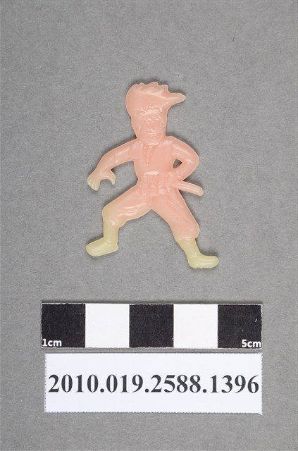 1.本物件為持劍人型尪仔仙。硬質塑膠材質,扁平,顏色有漸層效果,從粉紅色到黃色,大部分為粉紅色,雙面浮雕圖案,兩面圖案相同。圖案為站立男性,髮型斜向一邊,身穿背心式功夫服,腰間繫有腰帶,一手裡握住劍鞘,另一隻手張開,似要拉出劍。2.尪仔仙尺寸大致可分成小、中、大型,小型約長2-5公分,中型約長8-15公分,顏色以單色為主。有些大型的則可長達30公分左右,以菩薩、神仙和民間傳說故事人物等造型為主,塗上金銀紅黃彩漆等亮色。1960、70年代的尪仔仙多以民間傳說故事、歌仔戲、布袋戲人物為造型。1980年代改以卡通、電玩、漫畫人物造型為主。常見玩法之一為兩人(或多人)各持一只尪仔仙,輪流用手指彈射,看誰的尪仔仙先疊在對方上面,便可贏得對方用來對戰或是約定的尪仔仙。