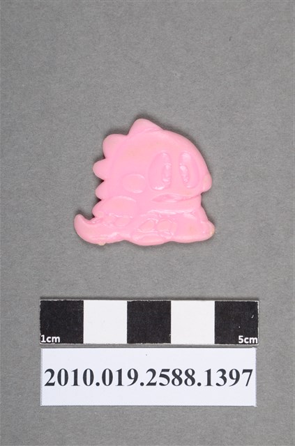 1.本物件為泡泡龍尪仔仙。硬質塑膠材質,扁平,單一不透明粉紅色,雙面浮雕圖案,兩面圖案相同。圖案為坐著的恐龍,可見腳底,背上有三角形骨質板,延伸至尾巴,嘴巴微開,有門牙,表情呈委屈貌。