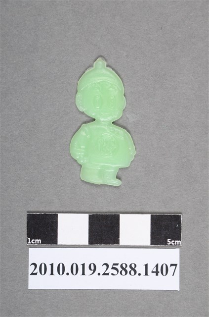 1.本物件為漫畫七龍珠之餃子尪仔仙。硬質塑膠材質,扁平,單一不透明綠色,雙面浮雕圖案,兩面圖案相同。圖案為站立的餃子,戴著瓜皮帽,臉頰左右有腮紅造型,穿著唐裝背心,正中間有鶴字樣,雙手擺放在身體兩側。2.《七龍珠》,由鳥山明所創作,1984年於週刊《JUMP》上連載,1986年改編為電視動畫。內容主要以主角悟空從小開始尋找散落在世界各地的七顆龍珠,找齊後召喚神龍可實現願望為背景,展開一連串冒險故事。3.尪仔仙尺寸大致可分成小、中、大型,小型約長2-5公分,中型約長8-15公分,顏色以單色為主。有些大型的則可長達30公分左右,以菩薩、神仙和民間傳說故事人物等造型為主,塗上金銀紅黃彩漆等亮色。1960、70年代的尪仔仙多以民間傳說故事、歌仔戲、布袋戲人物為造型。1980年代改以卡通、電玩、漫畫人物造型為主。常見玩法之一為兩人(或多人)各持一只尪仔仙,輪流用手指彈射,看誰的尪仔仙先疊在對方上面,便可贏得對方用來對戰或是約定的尪仔仙。
