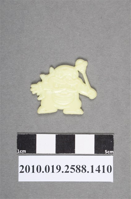 1.本物件為電玩超級瑪利歐兄弟(超級瑪利)之庫巴尪仔仙。硬質塑膠材質,扁平,單一不透明白色,雙面浮雕圖案,兩面圖案相同。庫巴有背殼,殼上有刺,嘴巴張開可見獠牙,一手拿著棒型武器,頂端有球體構件,一手往側邊伸。庫巴是超級瑪利歐兄弟電玩系列中的大魔王。