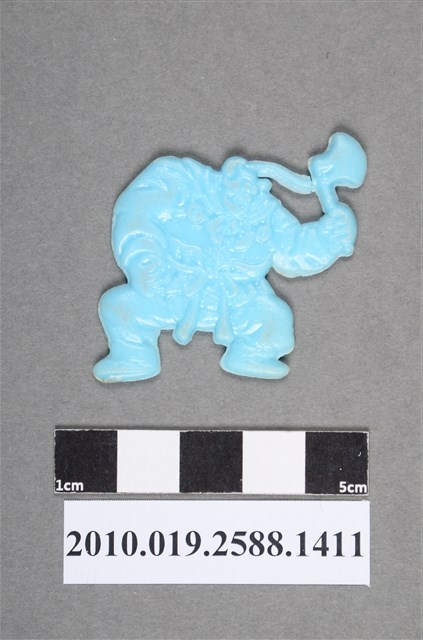 1.本物件為持斧人型尪仔仙。硬質塑膠材質,扁平,單一不透明藍色,雙面浮雕圖案,兩面圖案相同。圖案為站立人型,體型壯碩,腰間綁有繫帶,一手舉著斧頭,一手握拳,雙腳呈蹲馬步姿勢。2.尪仔仙尺寸大致可分成小、中、大型,小型約長2-5公分,中型約長8-15公分,顏色以單色為主。有些大型的則可長達30公分左右,以菩薩、神仙和民間傳說故事人物等造型為主,塗上金銀紅黃彩漆等亮色。1960、70年代的尪仔仙多以民間傳說故事、歌仔戲、布袋戲人物為造型。1980年代改以卡通、電玩、漫畫人物造型為主。常見玩法之一為兩人(或多人)各持一只尪仔仙,輪流用手指彈射,看誰的尪仔仙先疊在對方上面,便可贏得對方用來對戰或是約定的尪仔仙。
