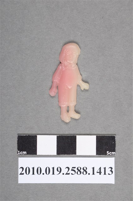 1.本物件為吊帶褲人型尪仔仙。硬質塑膠材質,扁平,顏色有漸層效果,從粉紅色到黃色,大部分為粉紅色,雙面浮雕圖案,兩面圖案相同。圖案為穿著吊帶褲的女孩,為站姿,髮型為長度在肩膀左右,有部分頭髮編為辮子,有瀏海。其雙手放在身旁,無特殊動作。2.尪仔仙尺寸大致可分成小、中、大型,小型約長2-5公分,中型約長8-15公分,顏色以單色為主。有些大型的則可長達30公分左右,以菩薩、神仙和民間傳說故事人物等造型為主,塗上金銀紅黃彩漆等亮色。1960、70年代的尪仔仙多以民間傳說故事、歌仔戲、布袋戲人物為造型。1980年代改以卡通、電玩、漫畫人物造型為主。常見玩法之一為兩人(或多人)各持一只尪仔仙,輪流用手指彈射,看誰的尪仔仙先疊在對方上面,便可贏得對方用來對戰或是約定的尪仔仙。