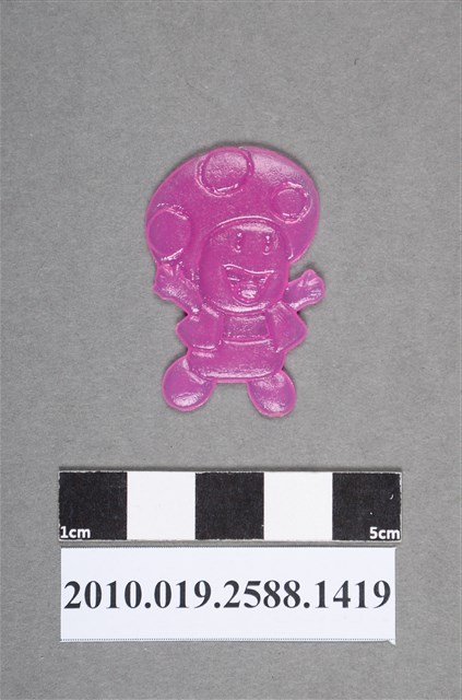 1.本物件為電玩超級瑪利歐兄弟(超級瑪利)之奇諾比奧尪仔仙。硬質塑膠材質,扁平,單一不透明桃紅色,雙面浮雕圖案,兩面圖案相同。圖案為擬人化的香菇,頭戴香菇帽,帽上有圓斑,穿著背心,張嘴笑,雙手往上伸,呈雀躍貌。在新版電玩遊戲設計中,奇諾比奧是香菇王國皇室的人。