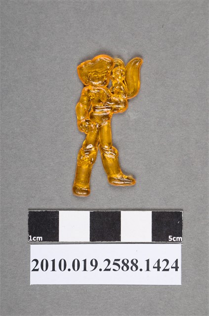 1.本物件為持松鼠人型尪仔仙。硬質塑膠材質,扁平,單一橙色,雙面浮雕圖案。正面圖案為站立男性,髮型蓬鬆,腳上穿靴子,右手臂站著1隻松鼠,可見松鼠膨尾巴。2.尪仔仙尺寸大致可分成小、中、大型,小型約長2-5公分,中型約長8-15公分,顏色以單色為主。有些大型的則可長達30公分左右,以菩薩、神仙和民間傳說故事人物等造型為主,塗上金銀紅黃彩漆等亮色。1960、70年代的尪仔仙多以民間傳說故事、歌仔戲、布袋戲人物為造型。1980年代改以卡通、電玩、漫畫人物造型為主。常見玩法之一為兩人(或多人)各持一只尪仔仙,輪流用手指彈射,看誰的尪仔仙先疊在對方上面,便可贏得對方用來對戰或是約定的尪仔仙。