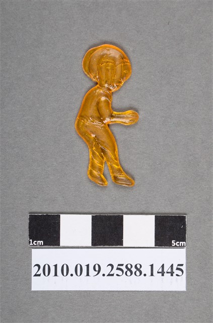1.本物件為橙色人型尪仔仙。硬質塑膠材質,扁平,單一橙色,雙面浮雕圖案。正面圖案為站立人型的側面,眼睛明顯,左手舉起。2.尪仔仙尺寸大致可分成小、中、大型,小型約長2-5公分,中型約長8-15公分,顏色以單色為主。有些大型的則可長達30公分左右,以菩薩、神仙和民間傳說故事人物等造型為主,塗上金銀紅黃彩漆等亮色。1960、70年代的尪仔仙多以民間傳說故事、歌仔戲、布袋戲人物為造型。1980年代改以卡通、電玩、漫畫人物造型為主。常見玩法之一為兩人(或多人)各持一只尪仔仙,輪流用手指彈射,看誰的尪仔仙先疊在對方上面,便可贏得對方用來對戰或是約定的尪仔仙。