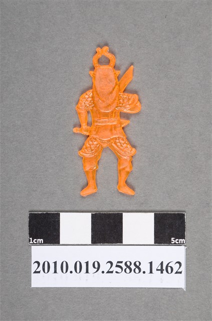 1.本物件為持雙刀人型尪仔仙。硬質塑膠材質,扁平,單一橘色,雙面浮雕圖案。正面圖案為牛頭人身,頭頂有彎曲牛角,身穿盔甲,雙手拿刀。2.尪仔仙尺寸大致可分成小、中、大型,小型約長2-5公分,中型約長8-15公分,顏色以單色為主。有些大型的則可長達30公分左右,以菩薩、神仙和民間傳說故事人物等造型為主,塗上金銀紅黃彩漆等亮色。1960、70年代的尪仔仙多以民間傳說故事、歌仔戲、布袋戲人物為造型。1980年代改以卡通、電玩、漫畫人物造型為主。常見玩法之一為兩人(或多人)各持一只尪仔仙,輪流用手指彈射,看誰的尪仔仙先疊在對方上面,便可贏得對方用來對戰或是約定的尪仔仙。