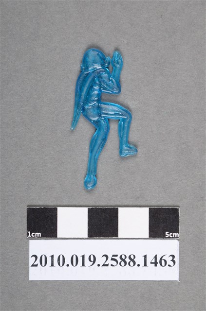 1.本物件為雙手交叉人型尪仔仙。硬質塑膠材質,扁平,單一藍色,雙面浮雕圖案。正面圖案為戴著頭盔身穿披風,雙手交叉於胸前,兩腳膝蓋微彎,擺出戰鬥姿勢的人型。2.尪仔仙尺寸大致可分成小、中、大型,小型約長2-5公分,中型約長8-15公分,顏色以單色為主。有些大型的則可長達30公分左右,以菩薩、神仙和民間傳說故事人物等造型為主,塗上金銀紅黃彩漆等亮色。1960、70年代的尪仔仙多以民間傳說故事、歌仔戲、布袋戲人物為造型。1980年代改以卡通、電玩、漫畫人物造型為主。常見玩法之一為兩人(或多人)各持一只尪仔仙,輪流用手指彈射,看誰的尪仔仙先疊在對方上面,便可贏得對方用來對戰或是約定的尪仔仙。