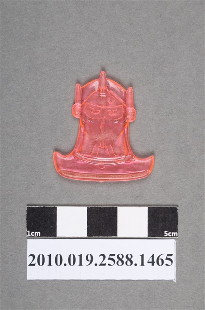 1.本物件為頭盔頭像尪仔仙。硬質塑膠材質,扁平,單一粉紅色,雙面浮雕圖案。正面圖案為戴面具型頭盔遮住全頭部,頭頂和耳朵上有尖角裝飾,頭盔造型延伸至脖子之頭像。2.尪仔仙尺寸大致可分成小、中、大型,小型約長2-5公分,中型約長8-15公分,顏色以單色為主。有些大型的則可長達30公分左右,以菩薩、神仙和民間傳說故事人物等造型為主,塗上金銀紅黃彩漆等亮色。1960、70年代的尪仔仙多以民間傳說故事、歌仔戲、布袋戲人物為造型。1980年代改以卡通、電玩、漫畫人物造型為主。常見玩法之一為兩人(或多人)各持一只尪仔仙,輪流用手指彈射,看誰的尪仔仙先疊在對方上面,便可贏得對方用來對戰或是約定的尪仔仙。