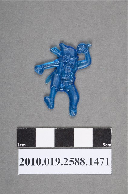 1.本物件為持劍人型尪仔仙。硬質塑膠材質,扁平,單一藍色,雙面浮雕圖案,兩面圖案相同。圖案為跳躍起來的男性,其髮型偏向一側,戴有護目鏡,穿著夾腳拖鞋。其一手抓著長劍要由背後往前揮,另一手握拳,一腳往後蹬,另一腳膝蓋向前彎曲。2.尪仔仙尺寸大致可分成小、中、大型,小型約長2-5公分,中型約長8-15公分,顏色以單色為主。有些大型的則可長達30公分左右,以菩薩、神仙和民間傳說故事人物等造型為主,塗上金銀紅黃彩漆等亮色。1960、70年代的尪仔仙多以民間傳說故事、歌仔戲、布袋戲人物為造型。1980年代改以卡通、電玩、漫畫人物造型為主。常見玩法之一為兩人(或多人)各持一只尪仔仙,輪流用手指彈射,看誰的尪仔仙先疊在對方上面,便可贏得對方用來對戰或是約定的尪仔仙。