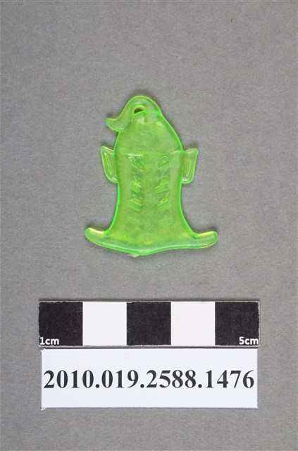 1.本物件為頭盔頭像尪仔仙。硬質塑膠材質,扁平,單一綠色,雙面浮雕圖案。正面圖案為戴面具型頭盔遮住全頭部,頭盔造型延伸至脖子,頭盔頂上有一截物品,眼睛底下有6條斜紋之頭像。2.尪仔仙尺寸大致可分成小、中、大型,小型約長2-5公分,中型約長8-15公分,顏色以單色為主。有些大型的則可長達30公分左右,以菩薩、神仙和民間傳說故事人物等造型為主,塗上金銀紅黃彩漆等亮色。1960、70年代的尪仔仙多以民間傳說故事、歌仔戲、布袋戲人物為造型。1980年代改以卡通、電玩、漫畫人物造型為主。常見玩法之一為兩人(或多人)各持一只尪仔仙,輪流用手指彈射,看誰的尪仔仙先疊在對方上面,便可贏得對方用來對戰或是約定的尪仔仙。