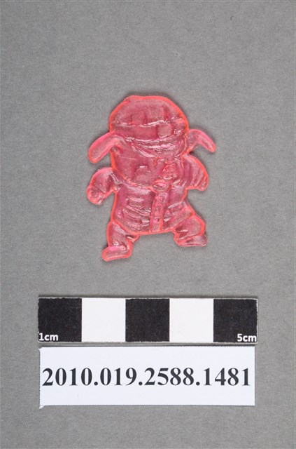1.本物件為漫畫七龍珠之烏龍尪仔仙。硬質塑膠材質,扁平,單一粉紅色,雙面浮雕圖案,兩面圖案相同。圖案為擬人化的小豬戴著帽子,面容生氣。2.七龍珠是日本漫畫家鳥山明的作品,格鬥冒險漫畫,西元1986年卡通動畫面世,最重要的主角是孫悟空。漫畫延伸出動畫、電影和電玩遊戲等產品,風靡全世界。3.尪仔仙尺寸大致可分成小、中、大型,小型約長2-5公分,中型約長8-15公分,顏色以單色為主。有些大型的則可長達30公分左右,以菩薩、神仙和民間傳說故事人物等造型為主,塗上金銀紅黃彩漆等亮色。1960、70年代的尪仔仙多以民間傳說故事、歌仔戲、布袋戲人物為造型。1980年代改以卡通、電玩、漫畫人物造型為主。常見玩法之一為兩人(或多人)各持一只尪仔仙,輪流用手指彈射,看誰的尪仔仙先疊在對方上面,便可贏得對方用來對戰或是約定的尪仔仙。