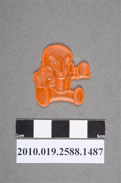 1.本物件為拳擊人型尪仔仙。硬質塑膠材質,扁平,單一橘色,雙面浮雕圖案,兩面圖案相同。圖案為光頭男生,眉毛明顯,呈坐姿,雙手握拳,有一拳往前擊。2.尪仔仙尺寸大致可分成小、中、大型,小型約長2-5公分,中型約長8-15公分,顏色以單色為主。有些大型的則可長達30公分左右,以菩薩、神仙和民間傳說故事人物等造型為主,塗上金銀紅黃彩漆等亮色。1960、70年代的尪仔仙多以民間傳說故事、歌仔戲、布袋戲人物為造型。1980年代改以卡通、電玩、漫畫人物造型為主。常見玩法之一為兩人(或多人)各持一只尪仔仙,輪流用手指彈射,看誰的尪仔仙先疊在對方上面,便可贏得對方用來對戰或是約定的尪仔仙。