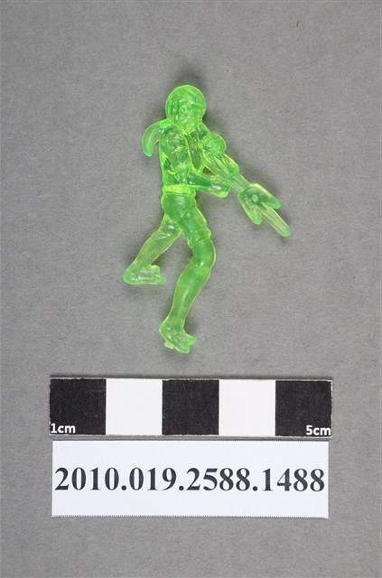 1.本物件為持三叉武器人型尪仔仙。硬質塑膠材質,立體,單一綠色。圖案為站姿人型,戴有頭盔,有馬尾,左肩上扛著武器,武器前端為三叉型,右手握著武器把手。2.尪仔仙尺寸大致可分成小、中、大型,小型約長2-5公分,中型約長8-15公分,顏色以單色為主。有些大型的則可長達30公分左右,以菩薩、神仙和民間傳說故事人物等造型為主,塗上金銀紅黃彩漆等亮色。1960、70年代的尪仔仙多以民間傳說故事、歌仔戲、布袋戲人物為造型。1980年代改以卡通、電玩、漫畫人物造型為主。常見玩法之一為兩人(或多人)各持一只尪仔仙,輪流用手指彈射,看誰的尪仔仙先疊在對方上面,便可贏得對方用來對戰或是約定的尪仔仙。