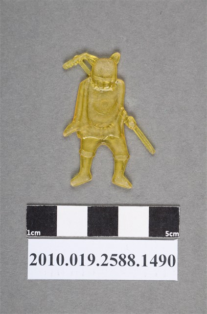 1.本物件為豬八戒尪仔仙。硬質塑膠材質,扁平,單一黃色,雙面浮雕圖案。正面圖案為豬八戒,上衣未扣,露出胸腹,寬袖,右手拿著釘耙。豬八戒為西遊記之角色。2.西遊記為明代吳承恩所作。內容為敘述孫悟空自大鬧天宮後,和豬八戒、沙悟淨保護唐三藏去西天取經,路上降妖伏魔,終成正果。3.尪仔仙尺寸大致可分成小、中、大型,小型約長2-5公分,中型約長8-15公分,顏色以單色為主。有些大型的則可長達30公分左右,以菩薩、神仙和民間傳說故事人物等造型為主,塗上金銀紅黃彩漆等亮色。1960、70年代的尪仔仙多以民間傳說故事、歌仔戲、布袋戲人物為造型。1980年代改以卡通、電玩、漫畫人物造型為主。常見玩法之一為兩人(或多人)各持一只尪仔仙,輪流用手指彈射,看誰的尪仔仙先疊在對方上面,便可贏得對方用來對戰或是約定的尪仔仙。
