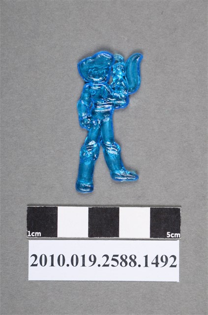 1.本物件為持松鼠人型尪仔仙。硬質塑膠材質,扁平,單一藍色,雙面浮雕圖案。正面圖案為站立男性,髮型蓬鬆,腳上穿靴子,右手臂站著1隻松鼠,可見松鼠膨尾巴。