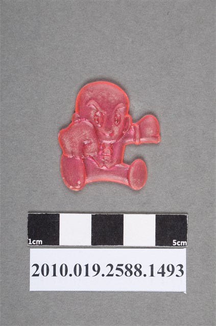 1.本物件為拳擊人型尪仔仙。硬質塑膠材質,扁平,單一粉紅色,雙面浮雕圖案,兩面圖案相同。圖案為光頭男生,眉毛明顯,呈坐姿,雙手握拳,有一拳往前擊。2.尪仔仙尺寸大致可分成小、中、大型,小型約長2-5公分,中型約長8-15公分,顏色以單色為主。有些大型的則可長達30公分左右,以菩薩、神仙和民間傳說故事人物等造型為主,塗上金銀紅黃彩漆等亮色。1960、70年代的尪仔仙多以民間傳說故事、歌仔戲、布袋戲人物為造型。1980年代改以卡通、電玩、漫畫人物造型為主。常見玩法之一為兩人(或多人)各持一只尪仔仙,輪流用手指彈射,看誰的尪仔仙先疊在對方上面,便可贏得對方用來對戰或是約定的尪仔仙。