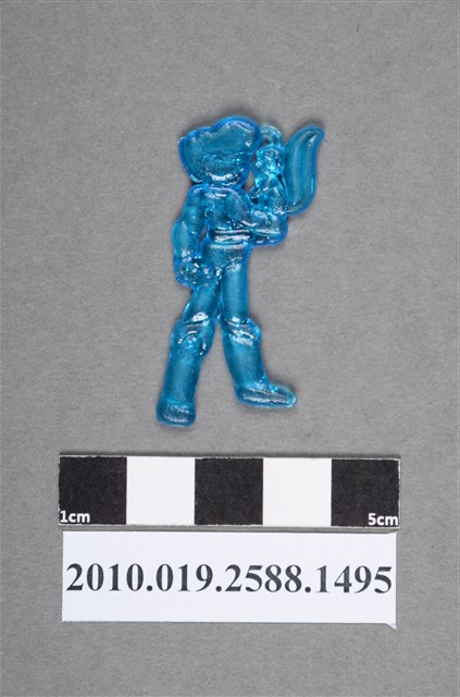 1.本物件為持松鼠人型尪仔仙。硬質塑膠材質,扁平,單一藍色,雙面浮雕圖案。正面圖案為站立男性,髮型蓬鬆,腳上穿靴子,右手臂站著1隻松鼠,可見松鼠膨尾巴。2.尪仔仙尺寸大致可分成小、中、大型,小型約長2-5公分,中型約長8-15公分,顏色以單色為主。有些大型的則可長達30公分左右,以菩薩、神仙和民間傳說故事人物等造型為主,塗上金銀紅黃彩漆等亮色。1960、70年代的尪仔仙多以民間傳說故事、歌仔戲、布袋戲人物為造型。1980年代改以卡通、電玩、漫畫人物造型為主。常見玩法之一為兩人(或多人)各持一只尪仔仙,輪流用手指彈射,看誰的尪仔仙先疊在對方上面,便可贏得對方用來對戰或是約定的尪仔仙。