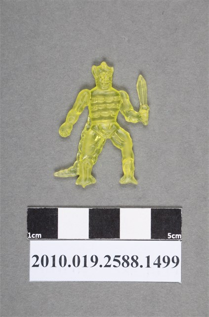 1.本物件為持劍人型尪仔仙。硬質塑膠材質,扁平,單一黃色,雙面浮雕圖案,兩面圖案相同。圖案為站立獸人,頭戴面具型頭盔遮住全頭部,上半身有一截截的紋路,右手拿短劍,有1條粗尾巴。2.尪仔仙尺寸大致可分成小、中、大型,小型約長2-5公分,中型約長8-15公分,顏色以單色為主。有些大型的則可長達30公分左右,以菩薩、神仙和民間傳說故事人物等造型為主,塗上金銀紅黃彩漆等亮色。1960、70年代的尪仔仙多以民間傳說故事、歌仔戲、布袋戲人物為造型。1980年代改以卡通、電玩、漫畫人物造型為主。常見玩法之一為兩人(或多人)各持一只尪仔仙,輪流用手指彈射,看誰的尪仔仙先疊在對方上面,便可贏得對方用來對戰或是約定的尪仔仙。