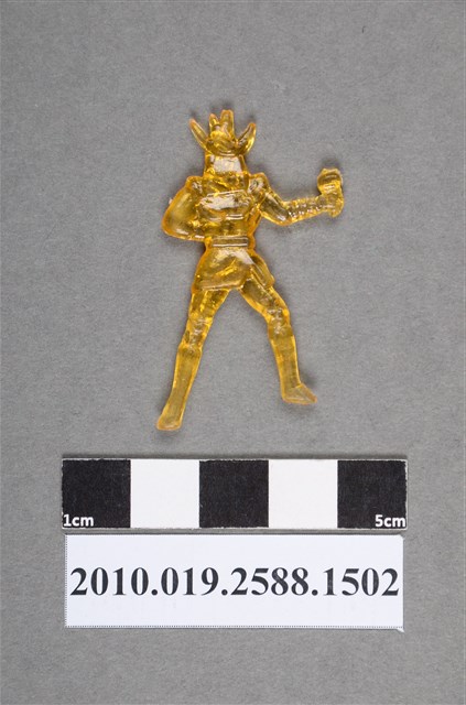 1.本物件為持槌人型尪仔仙。硬質塑膠材質,扁平,單一黃色,雙面浮雕圖案。正面圖案為站立人型,身穿戰甲,頭戴光芒狀頭盔,右手舉著槌型武器,左手彎曲於腹部,呈戰鬥姿勢。2.尪仔仙尺寸大致可分成小、中、大型,小型約長2-5公分,中型約長8-15公分,顏色以單色為主。有些大型的則可長達30公分左右,以菩薩、神仙和民間傳說故事人物等造型為主,塗上金銀紅黃彩漆等亮色。1960、70年代的尪仔仙多以民間傳說故事、歌仔戲、布袋戲人物為造型。1980年代改以卡通、電玩、漫畫人物造型為主。常見玩法之一為兩人(或多人)各持一只尪仔仙,輪流用手指彈射,看誰的尪仔仙先疊在對方上面,便可贏得對方用來對戰或是約定的尪仔仙。