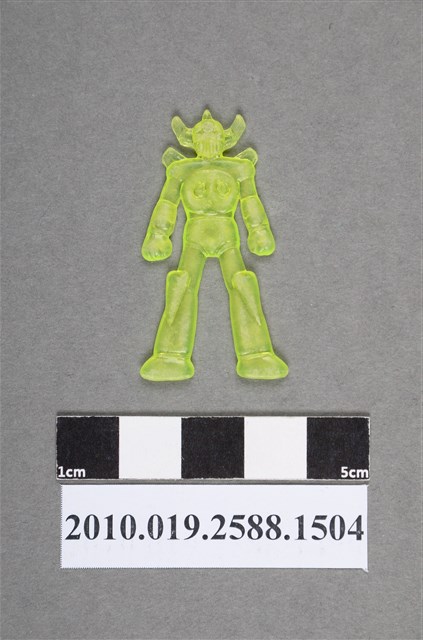 1.本物件為黃色機器人型尪仔仙。硬質塑膠材質,扁平,單一黃色,雙面浮雕圖案,兩面圖案相同。圖案為站立機器人型,頭部兩側有向上延伸的角狀物,頭頂亦有,嘴部有直立條紋,胸前有鼻子以上之骷顱頭圖案,膝蓋處有凸起之三角形構件。2.尪仔仙尺寸大致可分成小、中、大型,小型約長2-5公分,中型約長8-15公分,顏色以單色為主。有些大型的則可長達30公分左右,以菩薩、神仙和民間傳說故事人物等造型為主,塗上金銀紅黃彩漆等亮色。1960、70年代的尪仔仙多以民間傳說故事、歌仔戲、布袋戲人物為造型。1980年代改以卡通、電玩、漫畫人物造型為主。常見玩法之一為兩人(或多人)各持一只尪仔仙,輪流用手指彈射,看誰的尪仔仙先疊在對方上面,便可贏得對方用來對戰或是約定的尪仔仙。