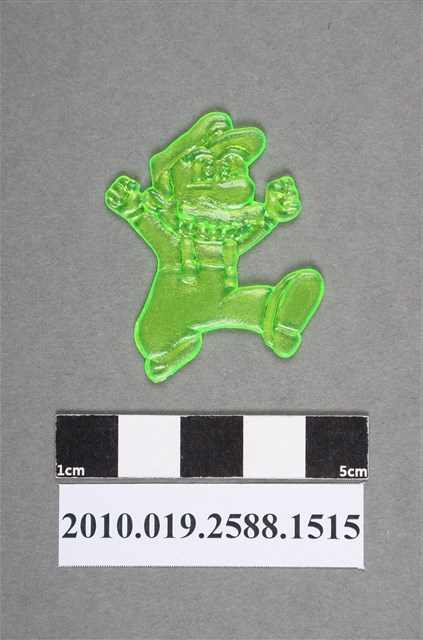 1.本物件為超級瑪利歐兄弟(超級瑪利)之瑪利歐尪仔仙。硬質塑膠材質,扁平,單一綠色,雙面浮雕圖案,兩面圖案相同。圖案為瑪利歐戴著帽子,穿著吊帶褲,雙手往上舉,一腳往前踢之貌。