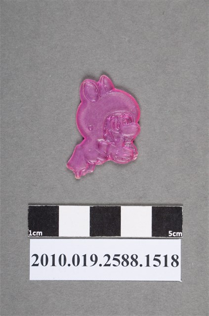 1.本物件為合手人型尪仔仙。硬質塑膠材質,扁平,單一桃紅色,雙面浮雕圖案,兩面圖案相同。圖案為身穿連頭披風之人型,頭頂上有2個應為耳朵的東西,鼻子比例大,雙手呈合手貌。