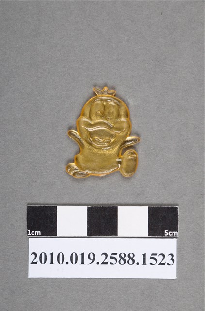 1.本物件為黃色雞型尪仔仙。硬質塑膠材質,扁平,單一黃色,雙面浮雕圖案,兩面圖案相同。圖案為擬人化小雞,頭頂有3根毛,嘴巴張開,眼睛有滴淚,翅膀往左右邊張開,呈走路貌。2.尪仔仙尺寸大致可分成小、中、大型,小型約長2-5公分,中型約長8-15公分,顏色以單色為主。有些大型的則可長達30公分左右,以菩薩、神仙和民間傳說故事人物等造型為主,塗上金銀紅黃彩漆等亮色。1960、70年代的尪仔仙多以民間傳說故事、歌仔戲、布袋戲人物為造型。1980年代改以卡通、電玩、漫畫人物造型為主。常見玩法之一為兩人(或多人)各持一只尪仔仙,輪流用手指彈射,看誰的尪仔仙先疊在對方上面,便可贏得對方用來對戰或是約定的尪仔仙。