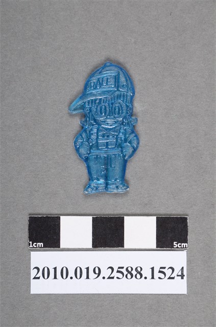 1.本物件為阿拉蕾尪仔仙。硬質塑膠材質,扁平,單一藍色,雙面浮雕圖案,兩面圖案相同。阿拉蕾為《怪博士與機器娃娃》漫畫主角,圖案為小女孩人型,張嘴笑,戴著帽子和眼鏡,帽上有「ARALE」字樣,穿著吊帶褲,雙手插在口袋。