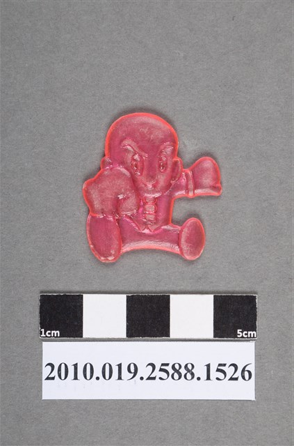 1.本物件為拳擊人型尪仔仙。硬質塑膠材質,扁平,單一粉紅色,雙面浮雕圖案,兩面圖案相同。圖案為光頭男生,眉毛明顯,呈坐姿,雙手握拳,有一拳往前擊。