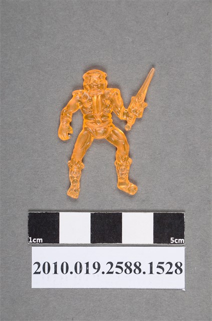 1.本物件為持劍人型尪仔仙。硬質塑膠材質,扁平,單一橘色,雙面浮雕圖案,兩面圖案相同。圖案為戴著頭盔的人型,服裝具戰鬥風格,有腰帶、護肩和靴子,一手握著劍型武器。2.尪仔仙尺寸大致可分成小、中、大型,小型約長2-5公分,中型約長8-15公分,顏色以單色為主。有些大型的則可長達30公分左右,以菩薩、神仙和民間傳說故事人物等造型為主,塗上金銀紅黃彩漆等亮色。1960、70年代的尪仔仙多以民間傳說故事、歌仔戲、布袋戲人物為造型。1980年代改以卡通、電玩、漫畫人物造型為主。常見玩法之一為兩人(或多人)各持一只尪仔仙,輪流用手指彈射,看誰的尪仔仙先疊在對方上面,便可贏得對方用來對戰或是約定的尪仔仙。