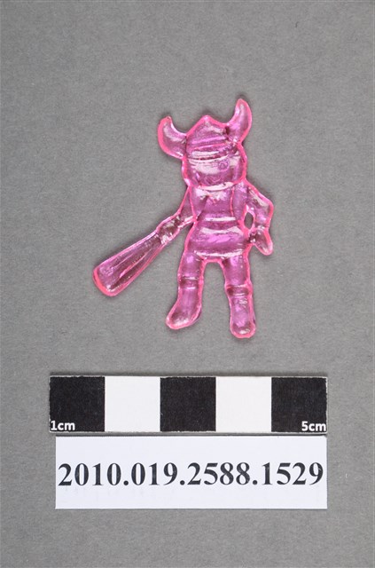 1.本物件為卡通北海小英雄之小威尪仔仙。硬質塑膠材質,扁平,單一粉紅色,雙面浮雕圖案。正面圖案為頭戴維京人帽子,腳穿靴子,左手拿棒子之男孩貌。