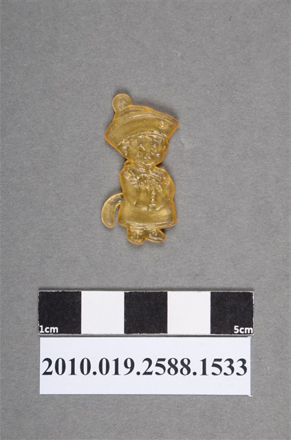 1.本物件為漫畫七龍珠之孫悟飯尪仔仙。硬質塑膠材質,扁平,單一黃色,雙面浮雕圖案,兩面圖案相同。圖案為孩童時期的悟飯,身穿中國風的袍子,頭戴帽子,雙手交握放在腹前,有尾巴。