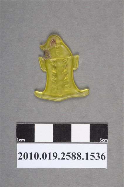 1.本物件為頭盔頭像尪仔仙。硬質塑膠材質,扁平,單一黃色,雙面浮雕圖案。正面圖案為戴面具型頭盔遮住全頭部,頭盔造型延伸至脖子,頭盔頂上有一截物品,眼睛底下有6條斜紋之頭像。背面略有髒汙。2.尪仔仙尺寸大致可分成小、中、大型,小型約長2-5公分,中型約長8-15公分,顏色以單色為主。有些大型的則可長達30公分左右,以菩薩、神仙和民間傳說故事人物等造型為主,塗上金銀紅黃彩漆等亮色。1960、70年代的尪仔仙多以民間傳說故事、歌仔戲、布袋戲人物為造型。1980年代改以卡通、電玩、漫畫人物造型為主。常見玩法之一為兩人(或多人)各持一只尪仔仙,輪流用手指彈射,看誰的尪仔仙先疊在對方上面,便可贏得對方用來對戰或是約定的尪仔仙。