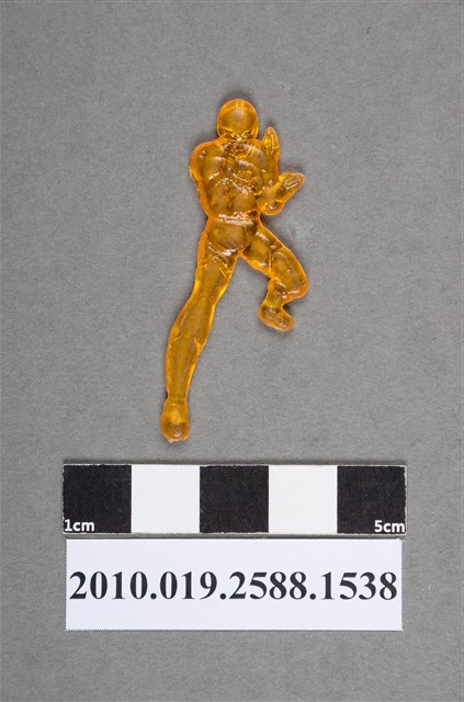 1.本物件為雙手交叉人型尪仔仙。硬質塑膠材質,扁平,單一橙色,雙面浮雕圖案。正面圖案為戴面具型頭盔遮住全頭部,雙手彎曲交叉在胸前呈十字型,右腳彎曲,左腳伸長,呈戰鬥姿勢。