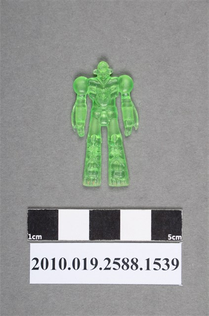 1.本物件為綠色機器人型尪仔仙。硬質塑膠材質,扁平,單一綠色,雙面浮雕圖案。正面圖案為機器人型,站立,胸前有個V字,肩膀造型為圓弧型,手臂有凸起片狀物之裝飾。