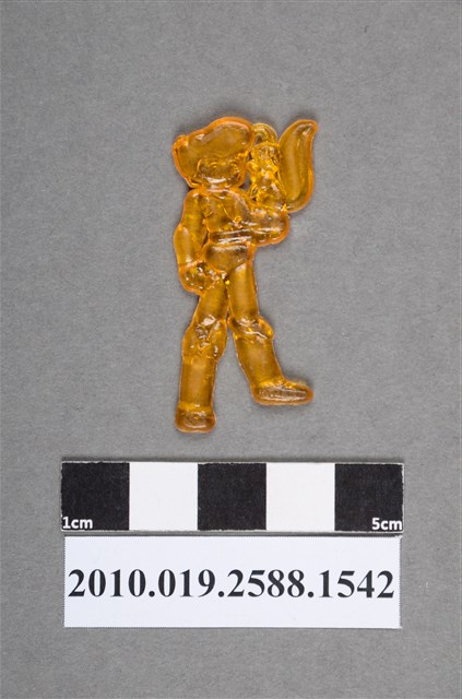 1.本物件為持松鼠人型尪仔仙。硬質塑膠材質,扁平,單一橙色,雙面浮雕圖案。正面圖案為站立男性,髮型蓬鬆,腳上穿靴子,右手臂站著1隻松鼠,可見松鼠膨尾巴。